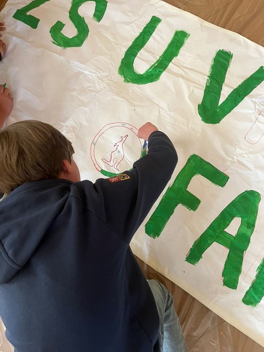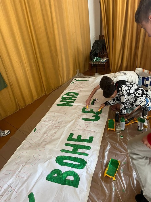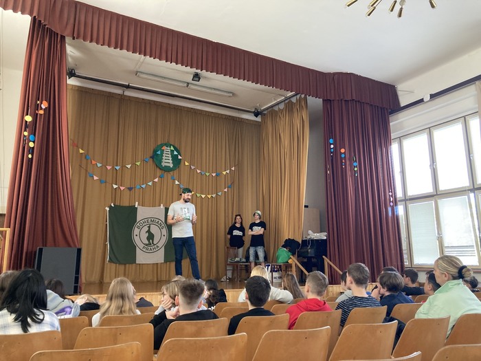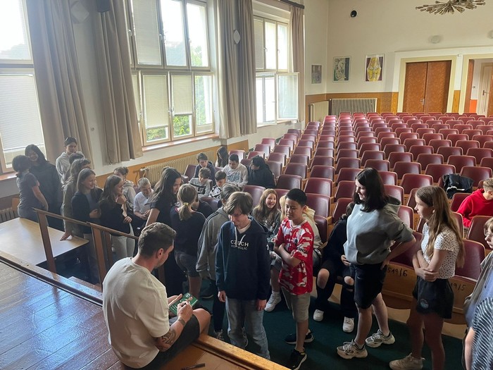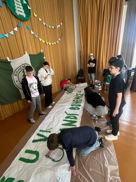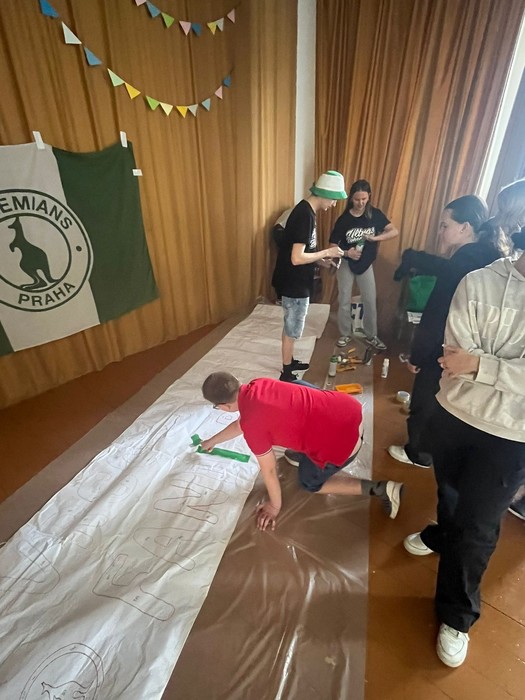 Zástupci fotbalového klubu Bohemians Praha 1905 navštívili naši školu a podebatovali s šesťáky o historii Bohemky nebo o legendárních gólech. Nakonec všichni společně vytvořili transparent, se kterým se šesťáci vydají do Ďolíčku na zápas.