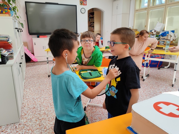 V květnu začal v přípravné třídě preventivní program Bezpečně nejen o prázdninách. Jde o projekt, který má dětem přiblížit fungování lidského těla, prevenci úrazů a základy první pomoci. Prvním setkáním nás provázela stavba lidského těla, funkce jednotlivých kostí a vnitřních orgánů. Při druhém setkání jsme si poslechli tlukot srdce a změřili tlak. Společně jsme si povídali o tom, jaká nebezpečí nás mohou potkat doma, ve škole, při sportu i hrách.
