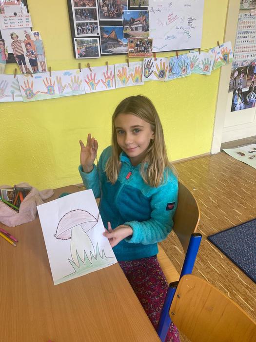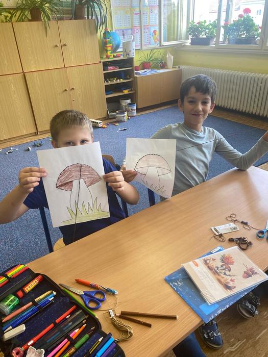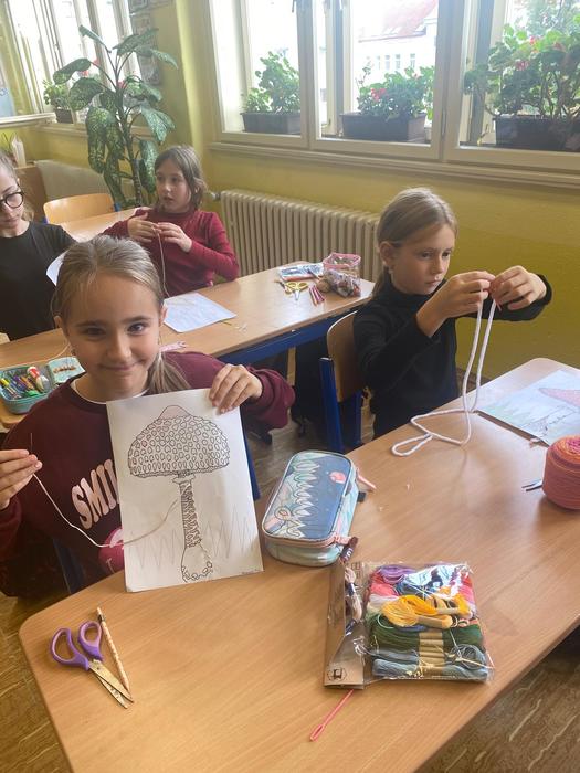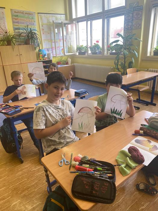 Poprvé v ruce jehla a nit! Houby jsme ve třídě sice nesbírali, ale povídali si o nich a vyšívali je. Byla to zábava, šití bylo prima a švadlenky byly moc šikovné.