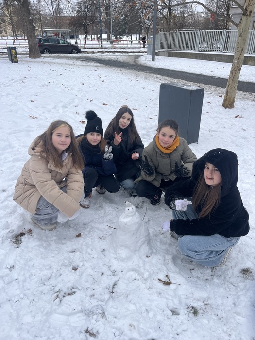 Třída 5. B si v rámci výtvarné výchovy vyzkoušela roli sochařů a ze sněhu vytesala sněhuláka v relaxu, strašáka, sněhuláka ve stylu jednorožce a jednoho malého roztomilého sněhuláčka.
